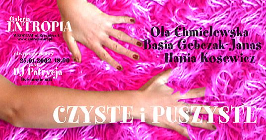 Kobiety wiedzą najlepiej jak sprawić aby było przyjemnie, miło i czysto. Trzy młode wrocławskie artystki pomogą Ci znaleźć się w dżungli puszystych zagadnień. 'Co sprawia, że jesteśmy tak czyste, tak pociągające?' - zadaje sobie pytanie Basia Gębczak-Janas. Jej obrazy są osobistą refleksją nad sytuacją kobiety, która jako podmiot reklam staje się zarazem przedmiotem promocyjnym. Ola Chmielewska zachęca zaś do rozkoszy zatopienia się w świeżości i przedstawia nową, poruszającą się zabawkę, która doprowadzi Cię do maksymalnego zachwytu. Hania Kosewicz wprawiona w stosowaniu środków wyrazu zarezerwowanych zazwyczaj dla gospodyń domowych jak np. robótki ręczne twierdzi, iż polubiła je ponieważ pozwalają na swobodę wypowiedzi, a ponadto są przytulne i bliskie życia. Sprawdź kondycję współczesnej higieny i sztuki zdaje się sugerować propozycja trzech autorek.