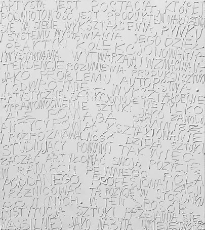 W teorii komunikacji pismo dzieli się na stronę produktywną i receptywną - na pisanie i czytanie jako dialogowo odnoszące się do siebie działania. Czytanie potrzebuje czasu i podąża za linearnoscią pisma. Podobnie obraz - najpierw malowany, dopiero później ogladany. Jednak podczas gdy w malarstwie tło i rysunek działają jako równouprawnieni antagoniści, w tekście pismo dominuje nad swoim tłem. Dzieje sie tak również dlatego, że dzieli je od tła kontrast koloru - zwykle czarnego na białym. W przypadku zaprezentowanych tutaj obrazów pismo jest jednak poprzez jednakową kolorystykę zlane ze swym tłem i sprawia wrażenie nieomal doskonałego kamuflażu, chociaż litery są wyciskane bezposrednio z tuby i, niczym relief, wznoszą się ponad powierzchnię płótna. Czytelność osiągają poprzez swoją przestrzenność, poprzez swój plastyczny charakter: Tak więc właściwie poprzez efekt, który zwykle musi być mozolnie osiągany za pomocą malarskiej iluzji. W ten sposób powstaje skryptura, która niczym widniejąca na papierze czerń drukarska liter w swoich wymiarach ulega spotęgowaniu; coś jak malarskie gesty pisma, których mieszana forma oscyluje pomiędzy ornamentalnymi liniami i zdefiniowanymi znakami. Tak powstaje splot linii, odstępów, znaków interpunkcyjnych i wersów, których regularność i kierunek wyobrażają pismo. Jego znaki przekazują informacje podkreślając równocześnie swój graficzny charakter, co z kolei utrudnia ich szybki odbiór - poprzez zamaskowanie znaków, farbę malarstwa. Obrazy te chcą być w pełni malarstwem, pozwolić oddziaływać zmysłowej farbie, formie i kompozycji. Ich malarskie gesty pozwalają stworzyć odniesienia choćby do modernistycznie wzniosłego malarstwa Roberta Rymana. Te pisane obrazy, chłodne i w swym teoretycznym podszyciu przepiękne, rozdzierają właściwą arenę pisma: widowisko sensu, możliwości rozumienia i czytelności. Intencjonalna i właściwie wewnętrzna czynność czytania, która sluży rozumieniu języka poprzez pisane znaki, zostaje zakłócona. Postrzeganie tekstu, wplecione we wzniosłe, zmysłowe oddziaływanie malarstwa, jest znacznie spowolnione. Tak długo, jak pismo zanika w kamuflażu koloru, obserwacja, uwolniona od swoich herrmeneutycznych założeń produkcji znaczeń, może otwierać się na jeszcze zupełnie inne, potencjalnie niekończące się procesy tworzenia sensu. Gdy tylko chłodne, wyobcowane pismo staje się czytelne, obserwator/czytelnik wprowadzony zostaje w hiperaktywną sytuację odbioru, w której kontemplacja musi ustąpić miejsca histerii. Paradoksalne obrazy-pisma Olgi Lewickiej nie są w stanie owej histerii zależności w sztuce pozbawić mocy, jednakże w jej zuchwałej refleksji, której towarzyszy spojrzenie Kippenbergera, zostaje owa histeria na moment przerwana i odroczona w czasie - i odroczona może się uspokoić. Możemy, wręcz powinniśmy dalej malować - i pisać.