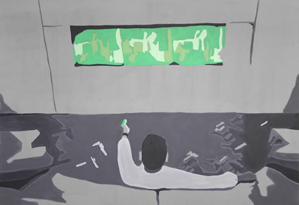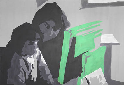 Obrazy pokazane w Entropii są fragmentem pracy zatytułowanej człowiekkomputersieć, na którą składają się również m.in. grafiki, film... i wspólnie tworzą jakość próbującą określić miejsce i znaczenie człowieka w świecie wszechpotężnej informacji. To zarazem badanie relacji, jakie zachodzą pomiędzy człowiekiem a elementami sieci informatycznej, zależności, podległości, niezbędności. Proces ten zachodzi w obydwu kierunkach. Nie istniałaby sieć informacji, gdyby nie ludzka mądrość i potrzeba szukania nowych rozwiązań technologicznych. Z kolei Internet pozbawia ograniczeń, poszerza horyzonty. Moduł 6 /użytkownicy/, taki tytuł noszą obrazy, w czarno-szarej tonacji, swą surowość przezwyciężają zielenią ekranów telefonu, kompa tych elektronicznych gadżetów i technologii, które służą człowiekowi i dzięki którym ludzie pomiędzy sobą łatwiej się porozumiewają. Choć moim głównym punktem zainteresowania jest sieć, wartością nadrzędną pozostaje człowiek w relacji (komunikacji) z drugim człowiekiem. Aga Migdałek |