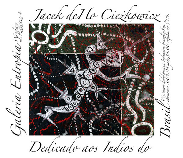Galeria Entropia zaprasza do obejrzenia wystawy "Dedicado aos Indios do Brasil" malarza amatora, doktora Jacka deHo Cieżkowicza. Idea prac zaprezentowanych na wystawie powstała podczas dwóch dni podróży do Brazylii w grudniu 2007 roku. 19 grudnia autor odwiedził wioskę Paraty-Mirim, gdzie mieszkają ostatni Indianie Guarani z Wybrzeża Brazylii a 27 grudnia Museu do Indio w Rio de Janeiro. Inspiracją dla prac była prawie zupełnie zapomniana, szczególnie w Brazylii, sztuka i kultura miejscowych Indian w konfrontacji z ich bardzo trudną obecną egzystencją oraz piękno ziemi brazylijskiej. Po zakończeniu wystawy przewidziana jest internetowa aukcja prac, a ew. dochód ze sprzedaży zostanie przekazany na pomoc materialną dla mieszkańców wioski Paraty-Mirim. Cena wywoławcza za każdą z prac wynosi 30 zł. Postępne 5 zł. Udział w aukcji bez wadium. Swoje oferty kupna należy zgłaszać na adres mailowy autora podając tytuł i proponowana cenę. Prace i szczegóły licytacji: http://dedicado-aos-indios-do-brasil.pdg.pl/ |